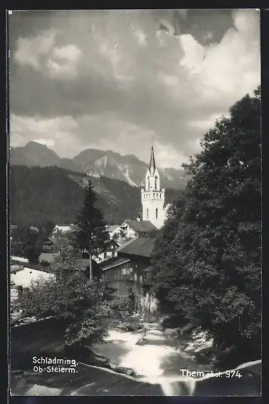 AK Schladming, Ortspartie mit Kirche und Bergpanorama