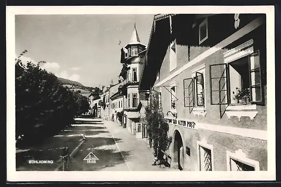 AK Schladming, Strassenpartie mit Gasthof zur alten Post