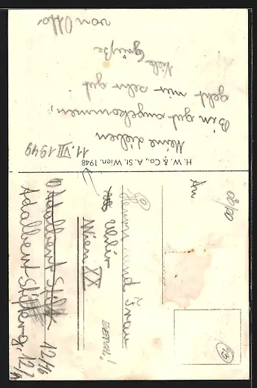 Personenbezogene Daten auf der Rückseite der Karte wurden durch blauen Textmarker unkenntlich gemacht. Die blauen Stellen sind auf die Vorderseite durchgeweicht und wirken sich negativ auf das Postkartenfoto aus
