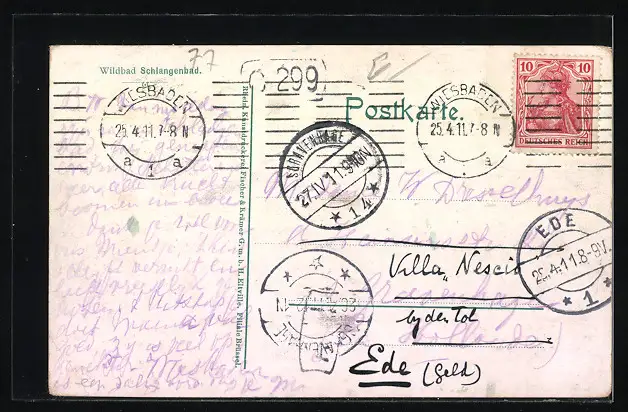 Personenbezogene Daten auf der Rückseite der Karte wurden durch blauen Textmarker unkenntlich gemacht. Die blauen Stellen sind auf die Vorderseite durchgeweicht und wirken sich negativ auf das Postkartenfoto aus