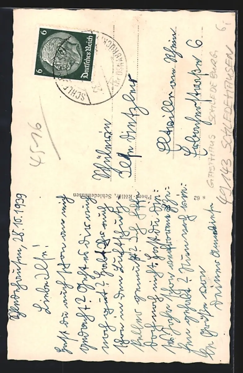 Personenbezogene Daten auf der Rückseite der Karte wurden durch blauen Textmarker unkenntlich gemacht. Die blauen Stellen sind auf die Vorderseite durchgeweicht und wirken sich negativ auf das Postkartenfoto aus