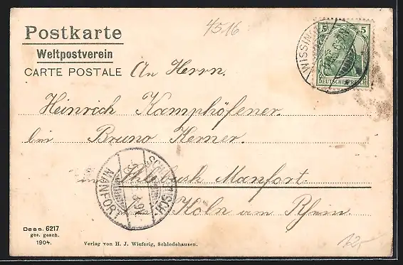 alte Ansichtskarte, gelaufen 1905, Eckknick li. oben, minimaler Einriss re. unten, guter Zustand