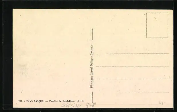 Personenbezogene Daten auf der Rückseite der Karte wurden durch blauen Textmarker unkenntlich gemacht. Die blauen Stellen sind auf die Vorderseite durchgeweicht und wirken sich negativ auf das Postkartenfoto aus