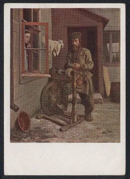 AK Schleifer beim Messerschleifen vor einem Küchenfenster