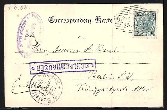 alte Ansichtskarte, gelaufen 1903, Stempelspur, guter Zustand
