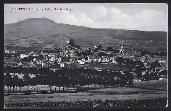 AK Schlettau i. Erzgeb., Ortsansicht mit dem Scheibenberg