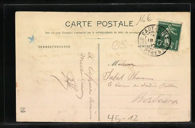 Personenbezogene Daten auf der Rückseite der Karte wurden durch blauen Textmarker unkenntlich gemacht. Die blauen Stellen sind auf die Vorderseite durchgeweicht und wirken sich negativ auf das Postkartenfoto aus