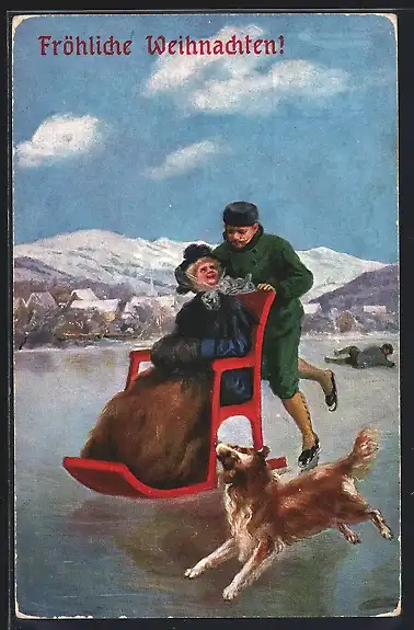 AK Schlittschuhläufer schiebt alte Frau im Schlitten über das Eis