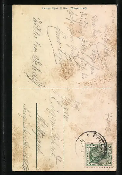 Personenbezogene Daten auf der Rückseite der Karte wurden durch blauen Textmarker unkenntlich gemacht. Die blauen Stellen sind auf die Vorderseite durchgeweicht und wirken sich negativ auf das Postkartenfoto aus