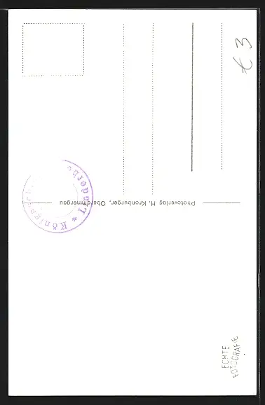 Personenbezogene Daten auf der Rückseite der Karte wurden durch blauen Textmarker unkenntlich gemacht. Die blauen Stellen sind auf die Vorderseite durchgeweicht und wirken sich negativ auf das Postkartenfoto aus