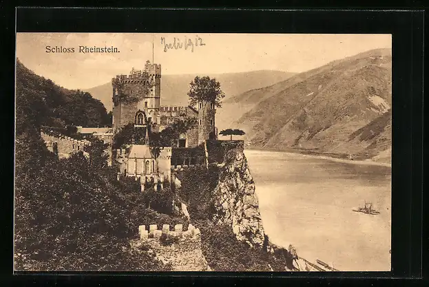 AK Schloss Rheinstein, Gesamtansicht mit Rheinblick