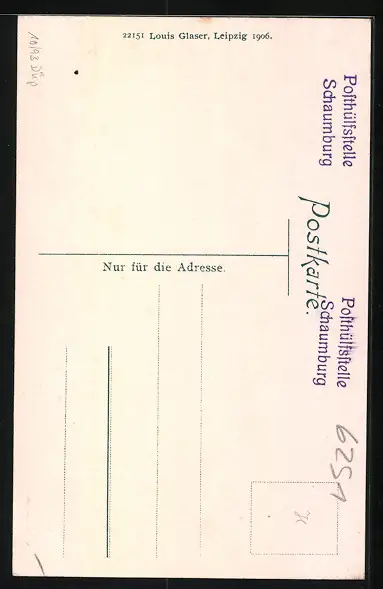 Personenbezogene Daten auf der Rückseite der Karte wurden durch blauen Textmarker unkenntlich gemacht. Die blauen Stellen sind auf die Vorderseite durchgeweicht und wirken sich negativ auf das Postkartenfoto aus