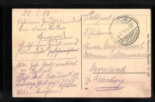 gelaufen als Feldpost 1918, guter Zustand