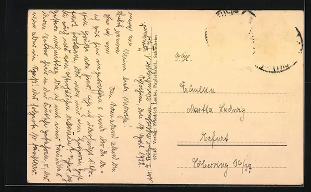 Personenbezogene Daten auf der Rückseite der Karte wurden durch blauen Textmarker unkenntlich gemacht. Die blauen Stellen sind auf die Vorderseite durchgeweicht und wirken sich negativ auf das Postkartenfoto aus
