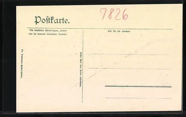 Personenbezogene Daten auf der Rückseite der Karte wurden durch blauen Textmarker unkenntlich gemacht. Die blauen Stellen sind auf die Vorderseite durchgeweicht und wirken sich negativ auf das Postkartenfoto aus
