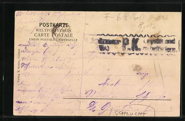 Personenbezogene Daten auf der Rückseite der Karte wurden durch blauen Textmarker unkenntlich gemacht. Die blauen Stellen sind auf die Vorderseite durchgeweicht und wirken sich negativ auf das Postkartenfoto aus