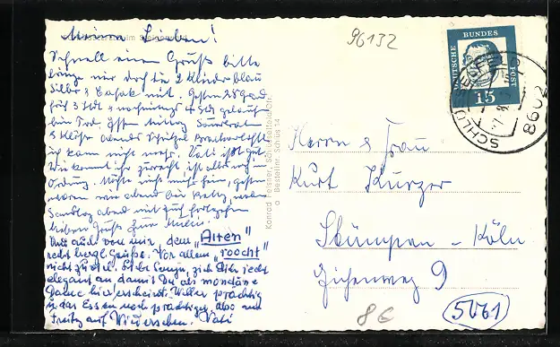 Personenbezogene Daten auf der Rückseite der Karte wurden durch blauen Textmarker unkenntlich gemacht. Die blauen Stellen sind auf die Vorderseite durchgeweicht und wirken sich negativ auf das Postkartenfoto aus