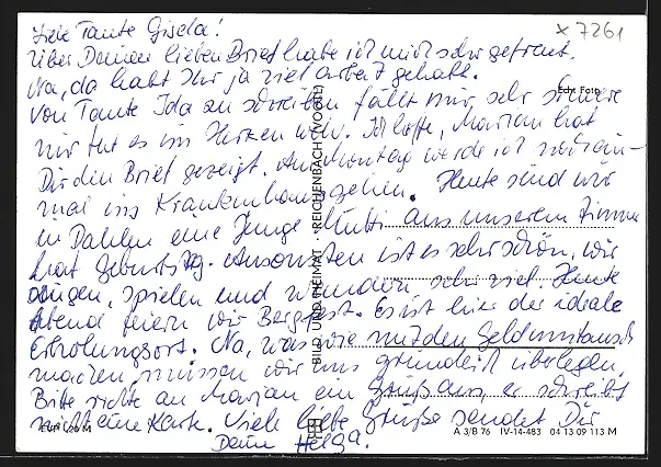 Personenbezogene Daten auf der Rückseite der Karte wurden durch blauen Textmarker unkenntlich gemacht. Die blauen Stellen sind auf die Vorderseite durchgeweicht und wirken sich negativ auf das Postkartenfoto aus