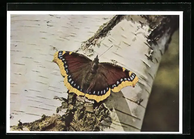 AK Schmetterling sitzt am Stamm einer Birke, Trauermantel, Vanessa antiopa