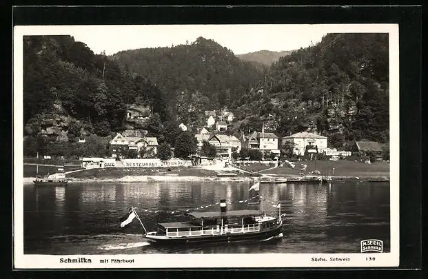 AK Schmilka /Sächs. Schweiz, Uferpartie mit Café-Restaurant-Pension Prüfer und Dampfboot