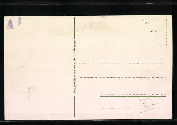 Personenbezogene Daten auf der Rückseite der Karte wurden durch blauen Textmarker unkenntlich gemacht. Die blauen Stellen sind auf die Vorderseite durchgeweicht und wirken sich negativ auf das Postkartenfoto aus