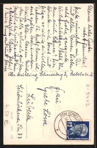 Personenbezogene Daten auf der Rückseite der Karte wurden durch blauen Textmarker unkenntlich gemacht. Die blauen Stellen sind auf die Vorderseite durchgeweicht und wirken sich negativ auf das Postkartenfoto aus