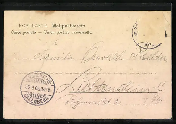 gelaufen 1905, Briefmarke entfernt, Eckknick li. oben, guter Zustand