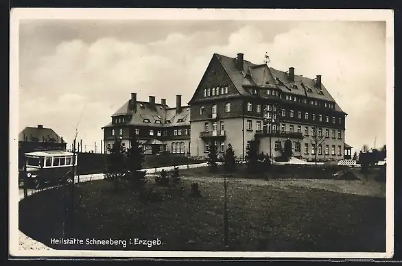 AK Schneeberg i. Erzgeb., Strassenpartie mit Heilstätte und Autobus