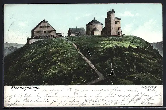 AK Schneekoppenhäuser im Riesengebirge bei grüner Wiese