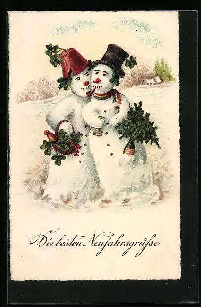 AK Schneemänner mit Kleeblättern verschmelzen, Neujahrsgrüsse