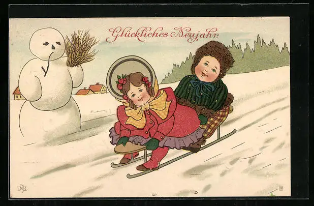 AK Schneemann sieht Mädchen auf einem Schlitten