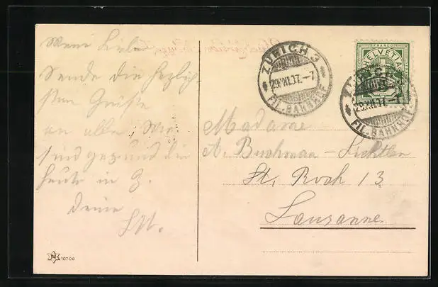 Personenbezogene Daten auf der Rückseite der Karte wurden durch blauen Textmarker unkenntlich gemacht. Die blauen Stellen sind auf die Vorderseite durchgeweicht und wirken sich negativ auf das Postkartenfoto aus