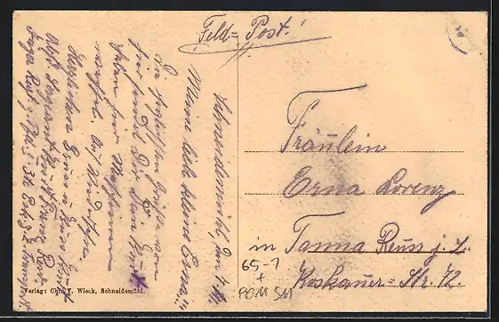 Personenbezogene Daten auf der Rückseite der Karte wurden durch blauen Textmarker unkenntlich gemacht. Die blauen Stellen sind auf die Vorderseite durchgeweicht und wirken sich negativ auf das Postkartenfoto aus