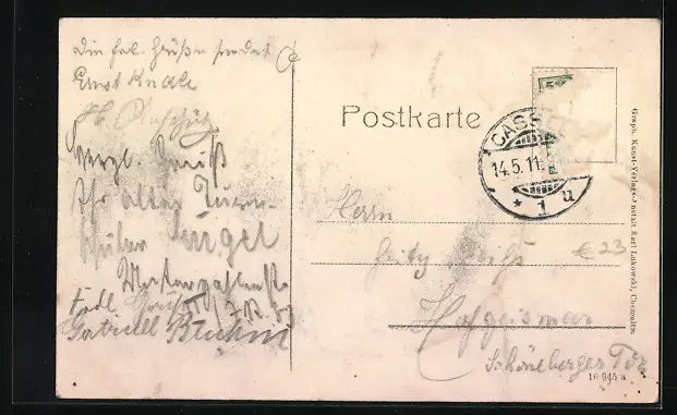 alte Ansichtskarte, gelaufen 1911, Briefmarke tw. entfernt, rückseitig Oberflächenschaden, minimale Einrisse li. u. re. mittig, guter Zustand