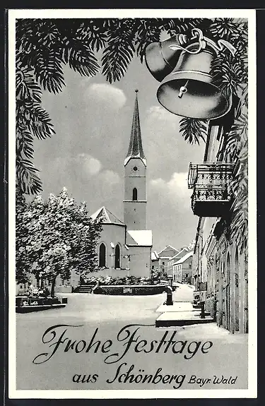 AK Schönberg / Bayr. Wald, Ortspartie mit Kirche im Winter