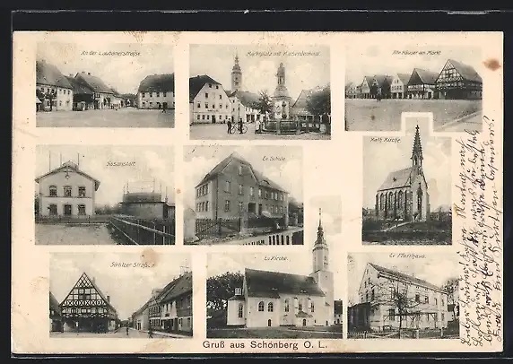 AK Schönberg, Görlitzer Strasse, Gastanstalt, Fachwerkshäuser am Markt