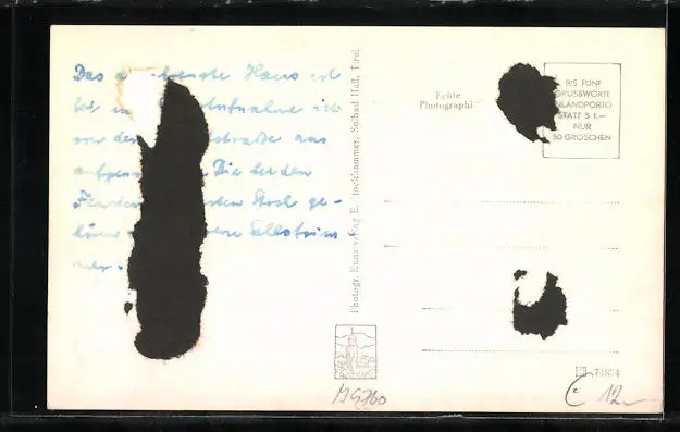 Personenbezogene Daten auf der Rückseite der Karte wurden durch blauen Textmarker unkenntlich gemacht. Die blauen Stellen sind auf die Vorderseite durchgeweicht und wirken sich negativ auf das Postkartenfoto aus