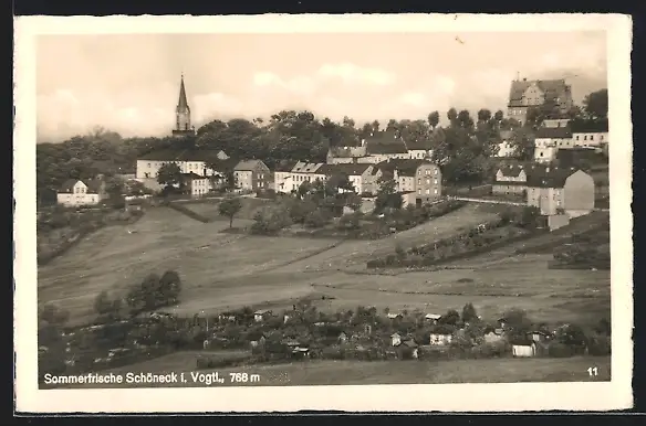 AK Schöneck i. V., Ortsansicht mit Kirche aus der Vogelschau