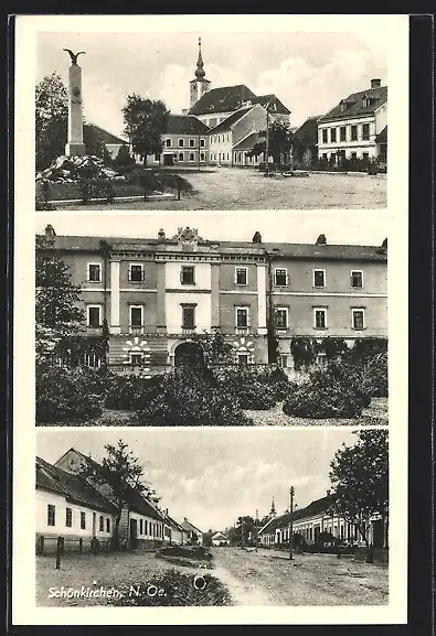 AK Schönkirchen, Denkmal, Strassenpartie und Ortspartie