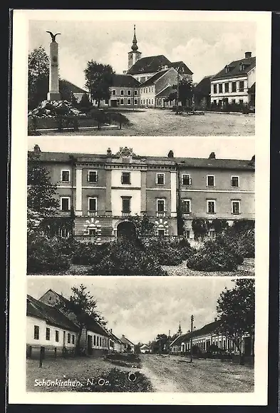 AK Schönkirchen, Strassenpartie im Ortskern, Kriegerdenkmal und Kirche