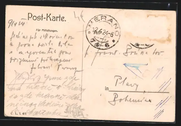 alte Ansichtskarte, gelaufen 1924, Briefmarke entfernt, rückseitig Oberflächenschaden, guter Zustand