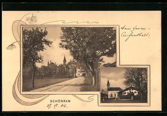 AK Schönram, Ortspartie mit Kirche, Strassenpartie