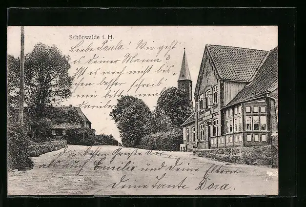 AK Schönwalde i. H., Strassenpartie mit Kirche