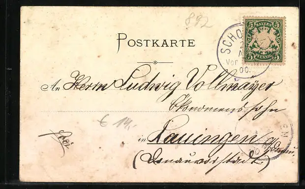 alte Ansichtskarte, gelaufen 1900, Eckknicke li. oben u. re. unten, guter Zustand
