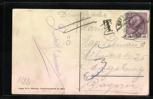 Personenbezogene Daten auf der Rückseite der Karte wurden durch blauen Textmarker unkenntlich gemacht. Die blauen Stellen sind auf die Vorderseite durchgeweicht und wirken sich negativ auf das Postkartenfoto aus