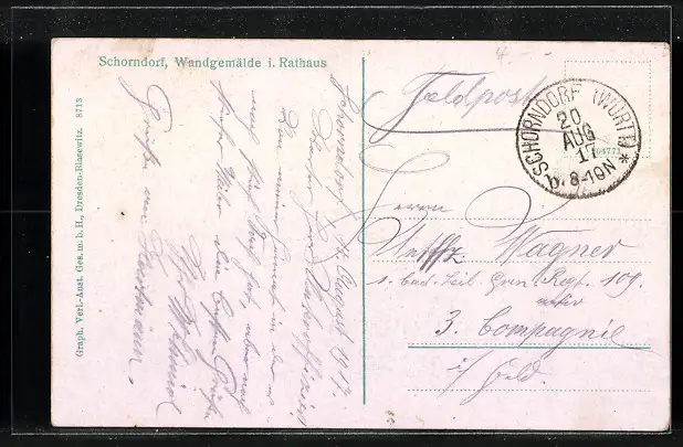 Personenbezogene Daten auf der Rückseite der Karte wurden durch blauen Textmarker unkenntlich gemacht. Die blauen Stellen sind auf die Vorderseite durchgeweicht und wirken sich negativ auf das Postkartenfoto aus