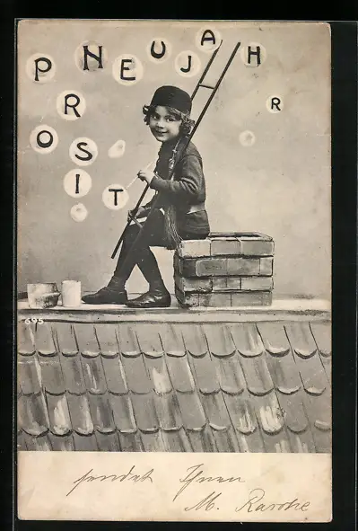 AK Schornsteinfeger auf dem Dach, Prosit Neujahr