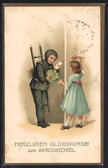 AK Schornsteinfeger bringt einem Mädchen Brief und Kleeblätter, Neujahrsgruss