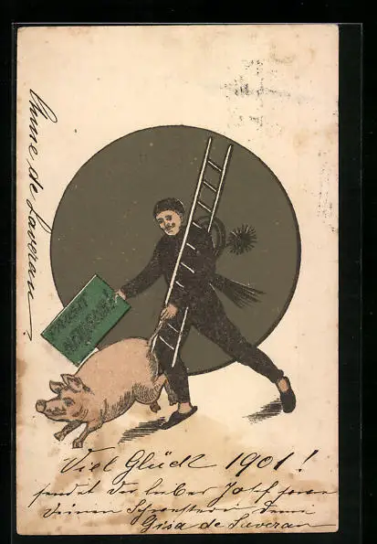 AK Schornsteinfeger mit Leiter und Glücksschwein