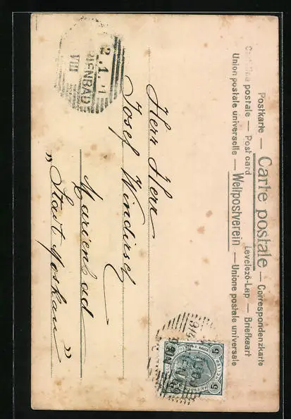 Personenbezogene Daten auf der Rückseite der Karte wurden durch blauen Textmarker unkenntlich gemacht. Die blauen Stellen sind auf die Vorderseite durchgeweicht und wirken sich negativ auf das Postkartenfoto aus